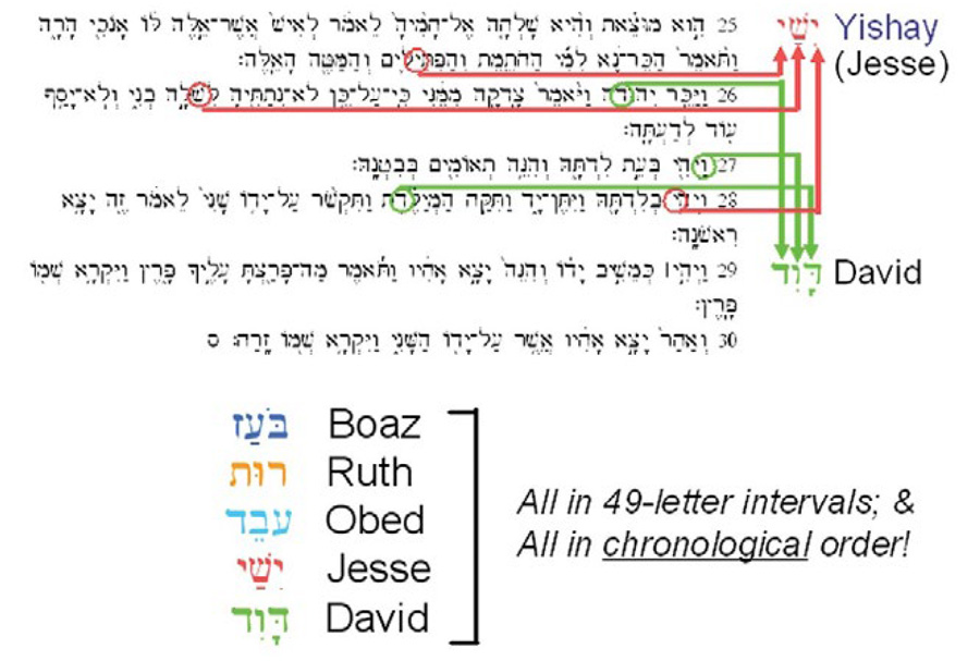 So here we have Boaz, Ruth, Obed, Jesse, and David in 49-letter intervals, all in chronological order, hidden in the text. Statistically, the likelihood of this happening by accident or chance is absurd. This is by design.