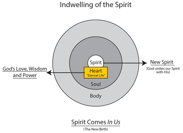 In response to our personal invitation, God’s Spirit of power comes in us (en) and indwells us. This is the time He unites our spirit with His and gives us a brand-new spirit and heart. This is called “the new birth” or being “born again” or “justification.” This is the time when Christ implants His eternal Life––His Love, His wisdom, and His power––in our spirits and hearts, and we become the temple of the Holy Spirit.